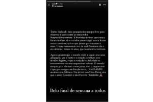 Pelos Stories, ele escreveu: “Tenho dedicado meu pouquíssimo tempo livre para observar o que ocorre ao meu redor. Surpreendentemente li histórias íntimas que nunca foram minhas, vi retratados amores que nunca foram meus e ouvi narrativas que jamais pertenceram a mim. O que exatamente vivi de real ?Somente ela e eu sabemos, nesses 16 anos, que realmente existiram.”