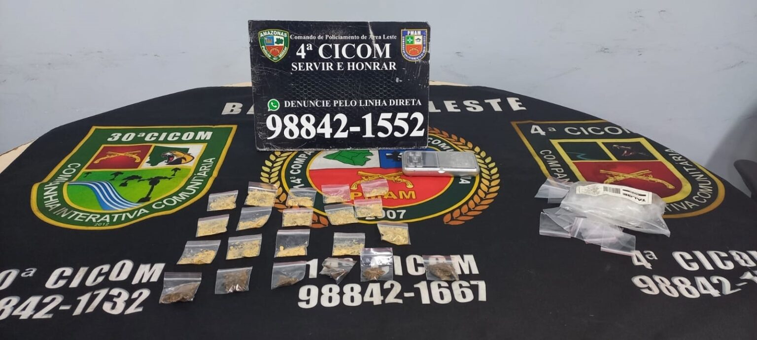 Policiais militares da 4ª Companhia Interativa Comunitária (Cicom) receberam denúncia, por volta das 9h10, relatando que um homem estava comercializando drogas na rua Presidente Figueiredo. Após diligências no local, um homem foi detido com 21 trouxinhas de entorpecentes.